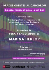 Artistas comprometidas con la causa ponen voz y sonidos a esta sesión especial, previa al 8M: Thaïs Cuadreny aka Fera, activista queer y música con más de quince años de trayectoria en la escena underground de Barcelona, iniciará los conciertos con su banda Fera y las Disidentes. Las seguirá una segunda actuación a cargo de la barcelonesa Marina Herlop, teclista de formación clásica que presentará en formato trío sus peculiares composiciones al piano, envueltas con capas de electrónica brillante y de sintetizadores.