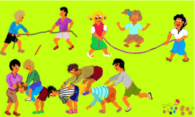 Al nostre barri, a part de caçar sargantanes i granotes al Rec Comtal, es jugava a jocs tradicionals, com a l’amagatall, a la gallina cega o d’altres com el Cavall Fort, què anava acompanyat de cançonetes, els que saltaven cantaven: “Els caps són de suro i no valen ni un duro” o bé “Xurro, mitxa manga, mangotero, adivina el que és”. A sota a la dreta hi han objectes de altres jocs populars com la Baldufa, Marbres (boles petites també anomenades Caniques), o Xavos (monedes de coure d’escàs valor com “las perras gordas”).
