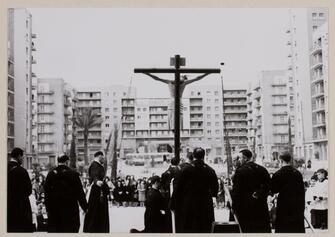 També és una fotografia de festivitat religiosa, veiem que a la plaça encara no hi ha campanar. Hi ha gent que comenta que potser és una fotografia de la inauguració de l'església, però no hi ha consens entre les persones assistents. Es cometna que es va construir una església “provisional”, de manera espartana, i fins al 66 o al 67 no es va acabar de posar el campanar i deixar-la perfecte. S'apunta que oficialment la inauguració és el 1965, data de cadastre.