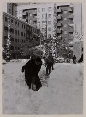 Veiem la plaça del Congrés Eucarístic tota emblanquinada. La fotografia deu ser de la nevada de 1962, de fet fou el 25 de desembre. Si bé hi ha gent que diu que és la plaça del Congrés, hi ha altres participants que no ho tenen tan clar.