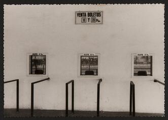 Fotografia de les taquilles on es venien butlletes d'apostes. Estaven situades a l'espai inferior del Canòdrom, al costat dels lavabos. On hi trobem ara mateix la sala Ada Lovelace, o sala d'actes. Precisament, on som ara mateix celebrant aquesta Jornada de Documentació Col·lectiva. Augusto del Rio era el fotògraf oficial del Canòdrom, però no podem saber amb seguretat si aquesta fotografia és seva o no. Al vidre de les taquilles, hi veiem el reflex de la pista de llebrers. Vàries persones recorden com de vegades hi havia cues de fins a 50 o 60 persones. L'entrada era lliure, i apostava qui volia. Les butlletes d'apostes funcionaven al principi mitjançant electroimants, i després amb lectors de codis de barres. Les persones participants més veteranes recorden com abans dels canòdroms, als anys 30’, hi havia un hipòdrom a Montjuïc, on ara hi ha el cementiri.
