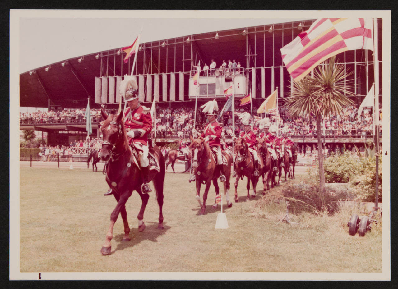 A la fotografia en color veiem el Canòdrom, on s’aprecia el Carrusel de la Guàrdia Urbana, muntats a cavall i amb un uniforme de color roig conjuntament amb el casc vistós de plomes. Es contemplen les grades plenes de gent, i es destaca que amb la celebració dels derbis es renovava tota la jardineria del Canòdrom.