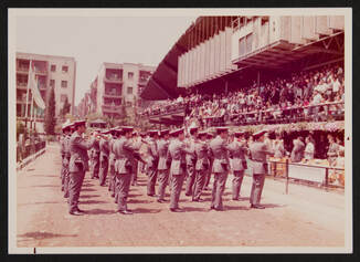 Fotografia dels anys 80, on hi veiem la plaça del Canòdrom acompanyada dels “ grisos” i les grades plenes d’homes. Segons els codis culturals de l’època, les dones soles als derbis no eren ben vistes i, si hi anaven, havien de ser acompanyades pels seus marits o familiars de gènere masculí.