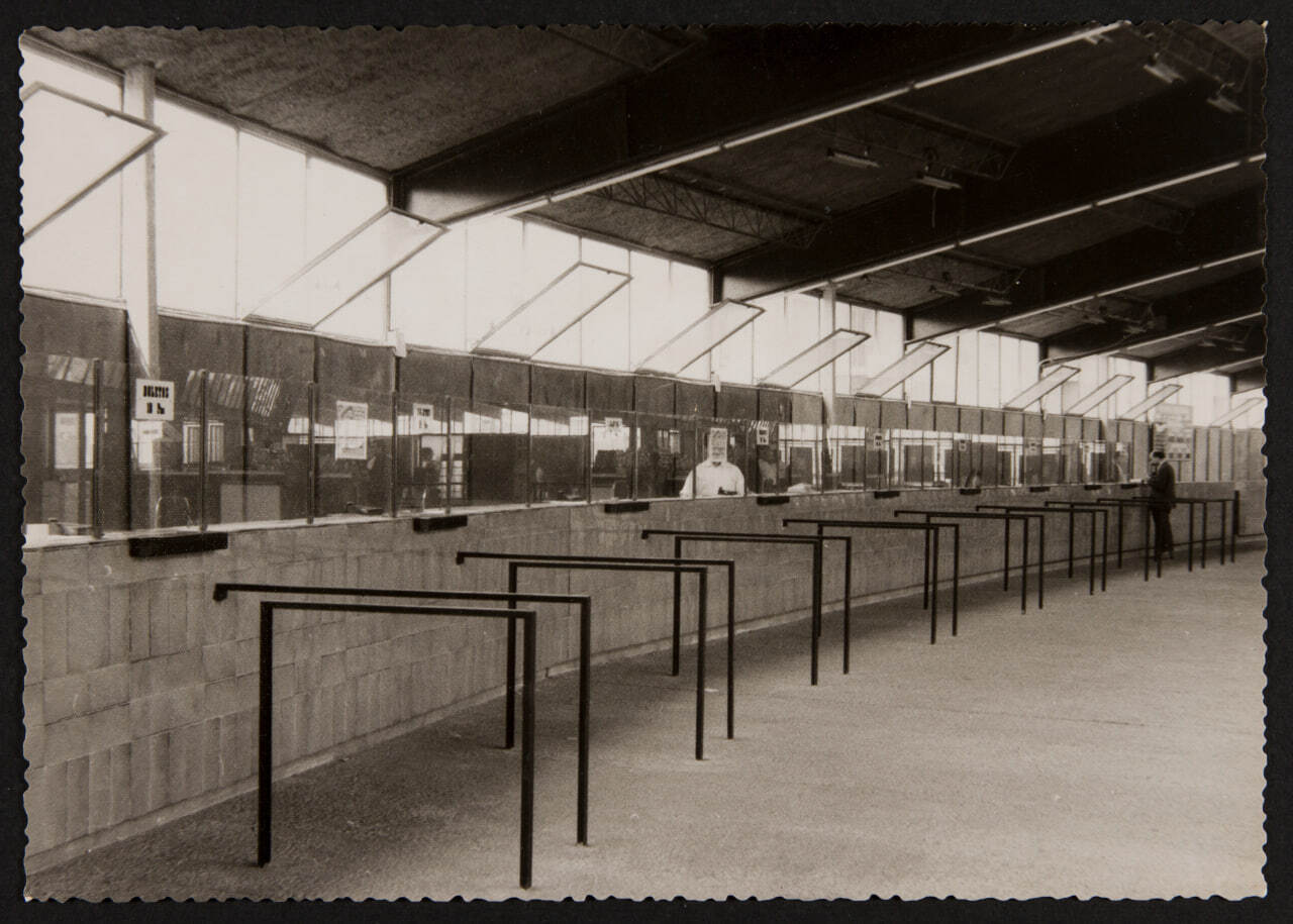 A la fotografia es contempla la zona de les apostes, on eren les taquilles a la part superior del Canòdrom. És una imatge dels anys 70 i sembla estar vinculada amb la foto dels “pagos boletos”, també en blanc i negre.