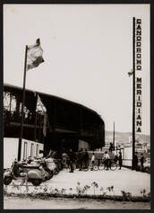 A la imatge s’aprecia l’entrada principal del que era el Canòdrom (actualment és l’accés a les grades). S’observa el pal o suport que apareix a la fotografia on posava: “Canódromo Meridiana”, que encara hi és però sense les lletres. De fet la paret de Riera d’Horta arribava fins on hi era aquest suport. També podem veure quatre banderes just a l’entrada. Identifiquem a molta gent fent cua esperant a entrar amb bicicletes i diverses motos aparcades.