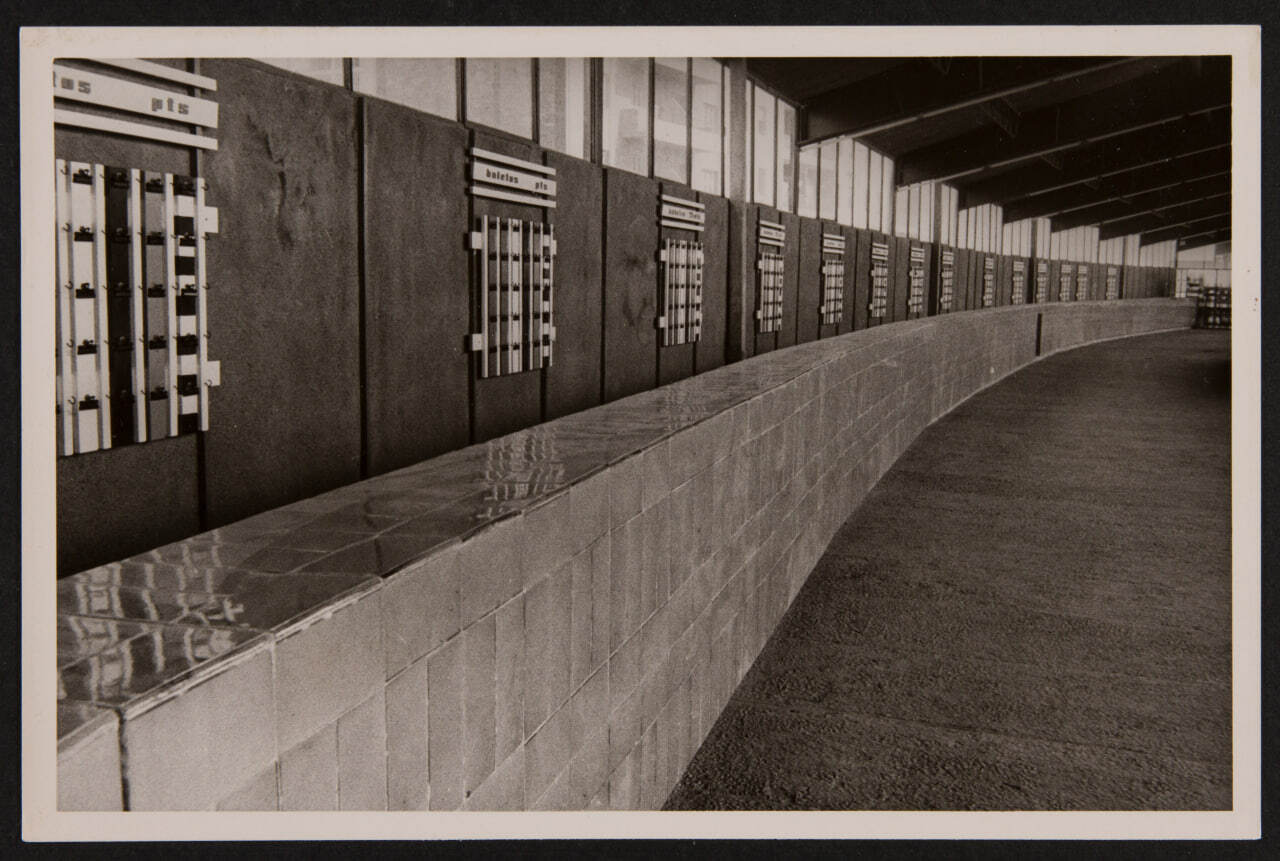Fotografia en blanc i negre on s’aprecia la zona del Canòdrom d’on es venien les butlletes, (els papers que consignaven un número per participar als derbis). A la imatge es contemplen totalment buides, però al començament de cada carrera estava ple de gent que volia accedir-hi per apostar pels llebrers. Hi havia un munt de finestres i el mur era molt llarg perquè hi cabessin quantes més persones, millor, així hi hauria més apostes i per tant, més diners en joc.