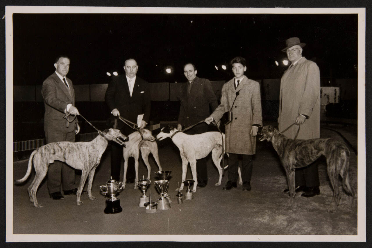 A la imatge podem veure cinc homes que són els propietaris dels llebrers i apareixen amb ells. Anys 60, surten tots arreglats i amb cares series. També s'aprecien els trofeus que van guanyar sota d’ells.