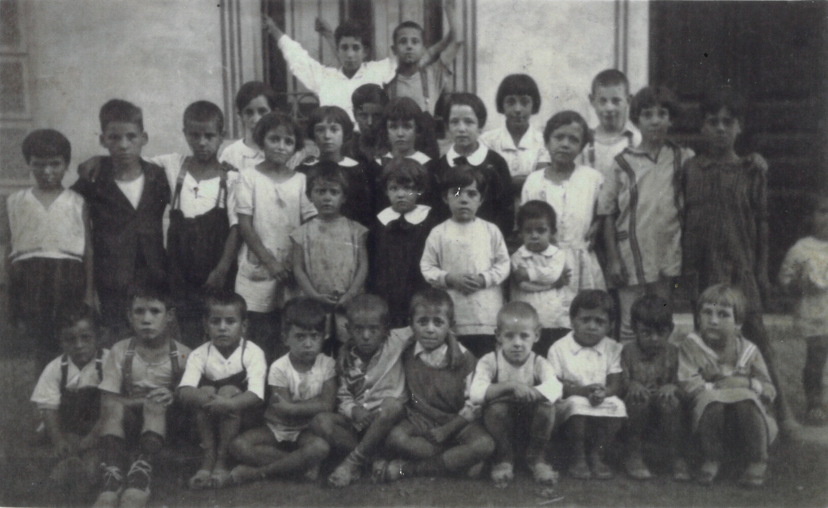 La cedent de la fotografia comenta que l'ha portat al Banc de Memòria Viva per les expressions de les cares dels nens i nenes. Creu que entre ells es troben el seu pare o el seu tiet. No sap exactament de quina escola es podria tractar, però de fons identifica el Passatge Arquitecte Millàs. Una participant comenta que potser la foto és d'abans de la guerra, atès que apareixen nens i nenes junts. Tal vegada, podrien ser alumnes de l'escola de la Cooperativa dels Tramviaires o la de l'Esperança. La conversa flueix reflexionant sobre l'ensenyament durant la postguerra i sobre vivències d'infància vinculades a les porteries dels edificis.