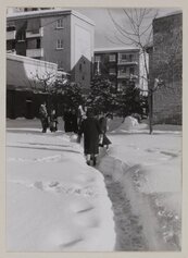 They locate the photographs in the neighborhood of the Congress. The snow caught all the neighbors off guard; on Sant Esteve day of 1962, the city woke up covered by a blanket of snow. People didn't have suitable clothes for the snow, like the woman in the photo, who wears a skirt, stockings, and shoes. They also mention that the city collapsed and that the mayor at that time bought some snow removal machines that were never used again.