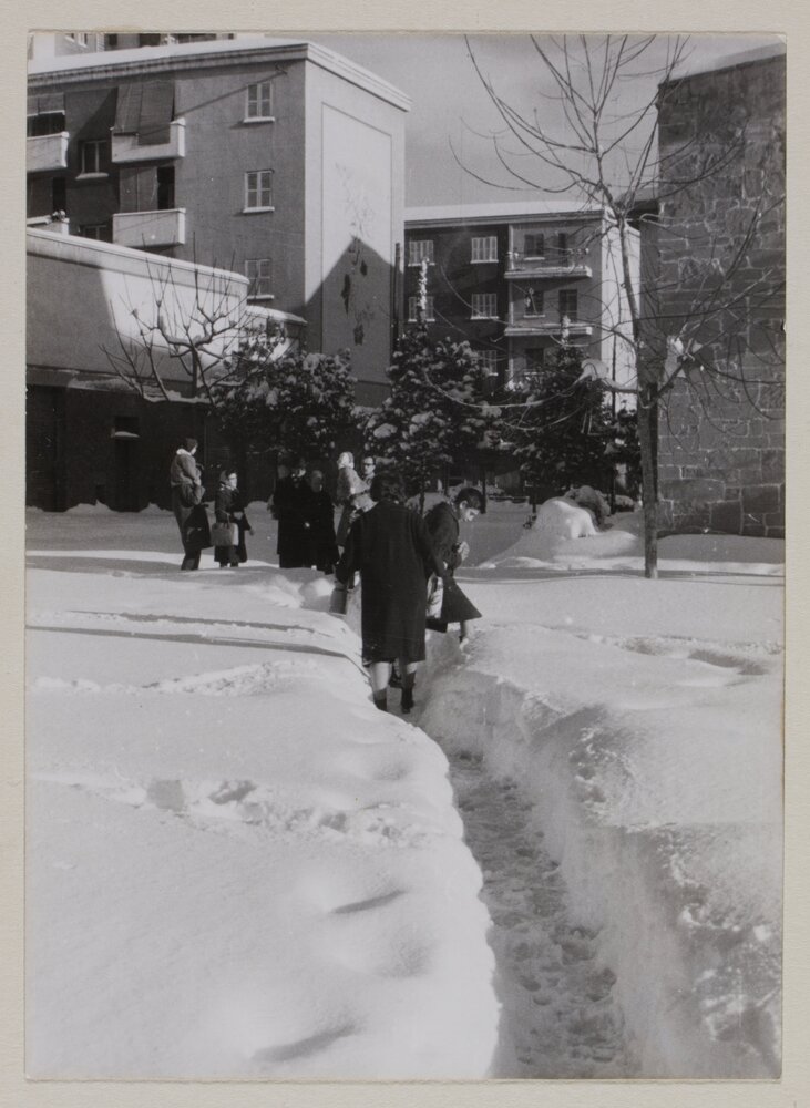 Ubican la fotografía en el barrio del Congreso. La nevada tomó desprevenidos a todos los vecinos, en el día de Sant Esteve de 1962 la ciudad amaneció cubierta por un manto de nieve. Las personas no tenían ropas adecuadas para la nieve, como por ejemplo la mujer de la foto, quien lleva falda, medias y zapatos finos. También comentan que la ciudad colapsó y que el alcalde de ese entonces compró unas máquinas quita nieve que luego no se usaron más.