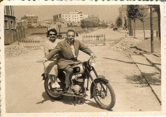 En aquesta foto veiem en Francesc Puig i na Magdalena Faura muntats en una motocicleta OSA propietat del seu fill Josep Puig. La foto es situa al carrer de Las Navas de Tolosa cantonada amb el carrer Freser l'any 1953.